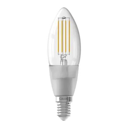 Ben je op zoek naar slimme E14 LED verlichting van topkwaliteit? Dan maak je met deze Calex Smart LED Filament Kaars een uitstekende keuze! Deze Calex Smart lamp heeft de bekende E14 schroeffitting en helder glas, waardoor je het LED Filament goed zit! Qua vermogen verbruikt deze Smart verlichting slechts 4,5 Watt. Daardoor ga je fors besparen op je energiekosten, want deze slimme LED verlichting is de energiezuinige vervanger van conventionele E14 gloeilampen. Verder gaat deze Calex E14 LED verlichting 15.000 branduren mee en krijg je bij aankoop 2 jaar Lampdirect all-in garantie. Daarnaast draag je een steentje bij aan een schonere wereld, wanneer je kiest voor LED.